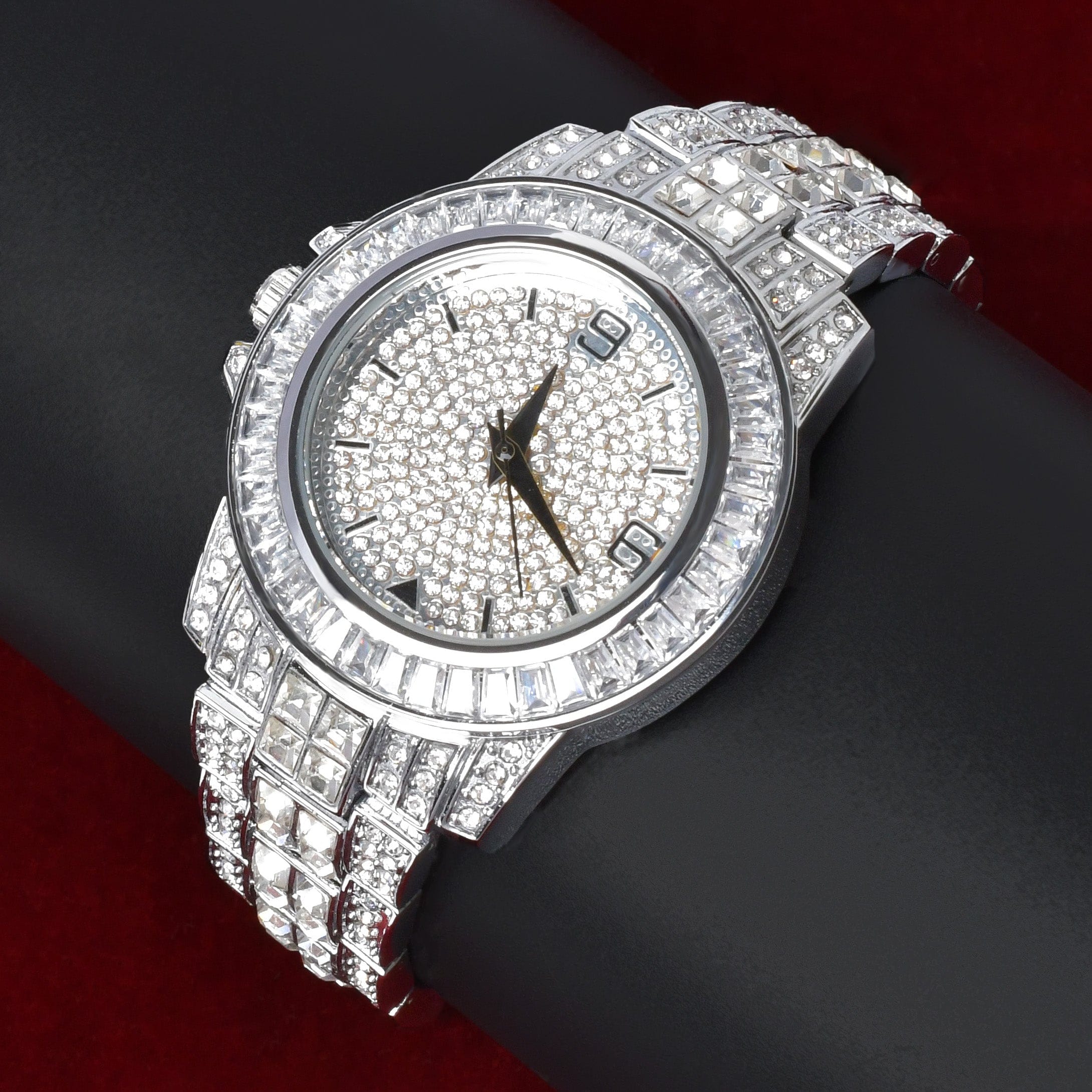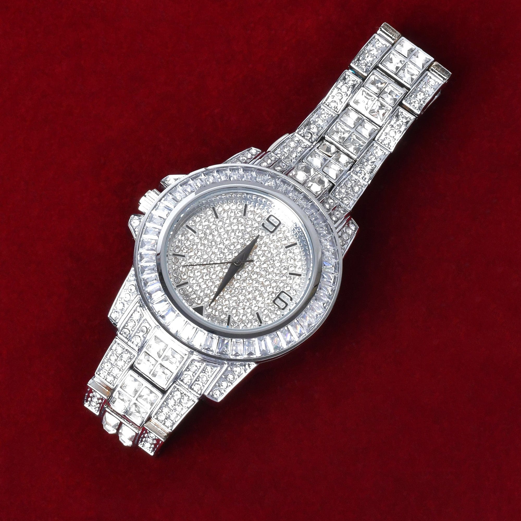 Μοιάζει με τεμάχιο χρόνου 30.000 $. Καλύπτεται πλήρως με πάνω από 17 καράτια γνήσιων τσέχικων κρυστάλλων. Ολόκληρο το καντράν, το πλαίσιο, η θήκη και η μπάντα είναι παγωμένα. Το καντράν διαθέτει επίσης κομψές πέτρες από μπαγκέτα. Το ρολόι είναι κατασκευασμένο από κράμα μετάλλου και διαθέτει ορυκτό γυαλί. Στο εσωτερικό του τροφοδοτείται από μια κίνηση ιαπωνικού Quartz για αξιόπιστη χρονομέτρηση.
