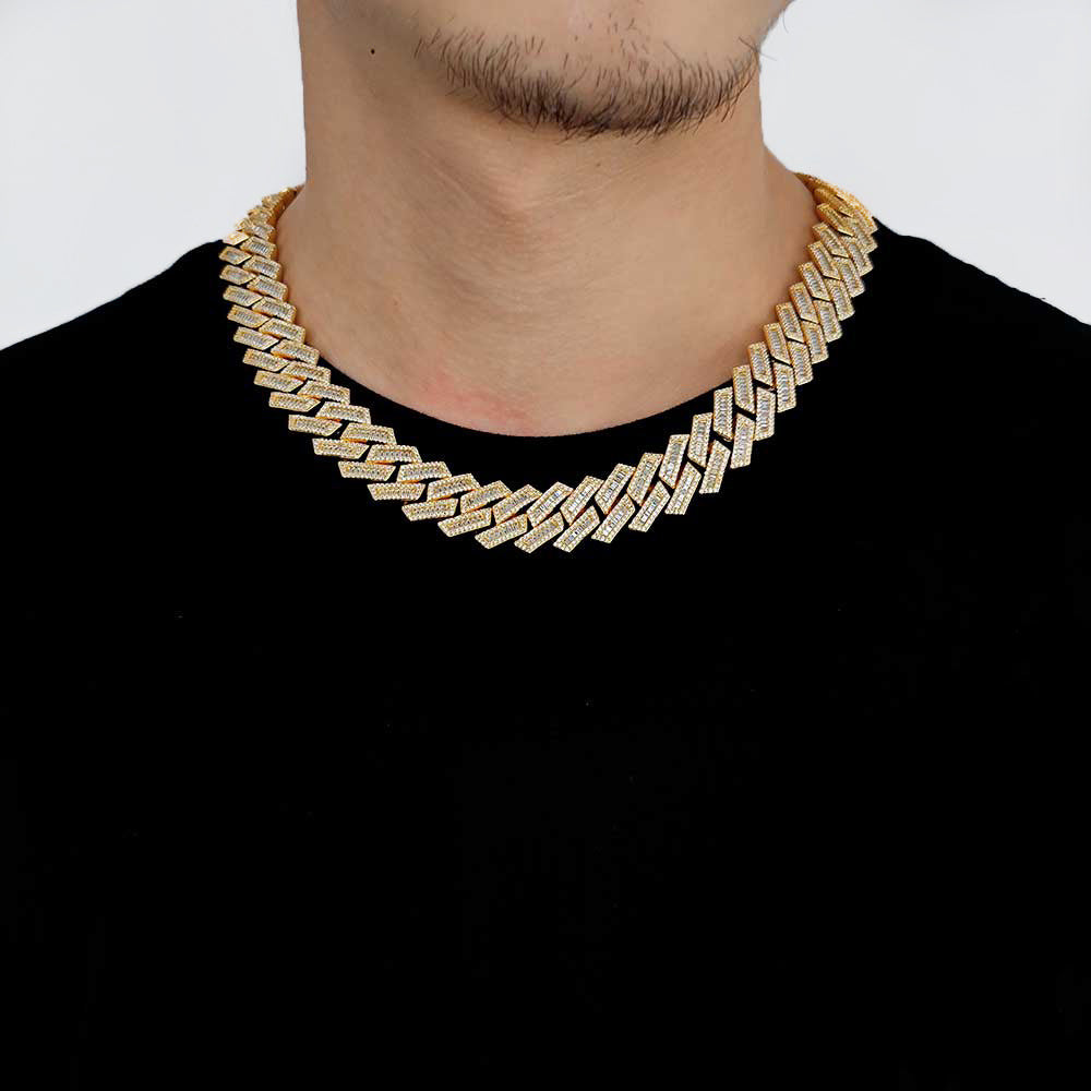 Diamond Gold 20mm Prong Three-Row Cuban Link Chain
