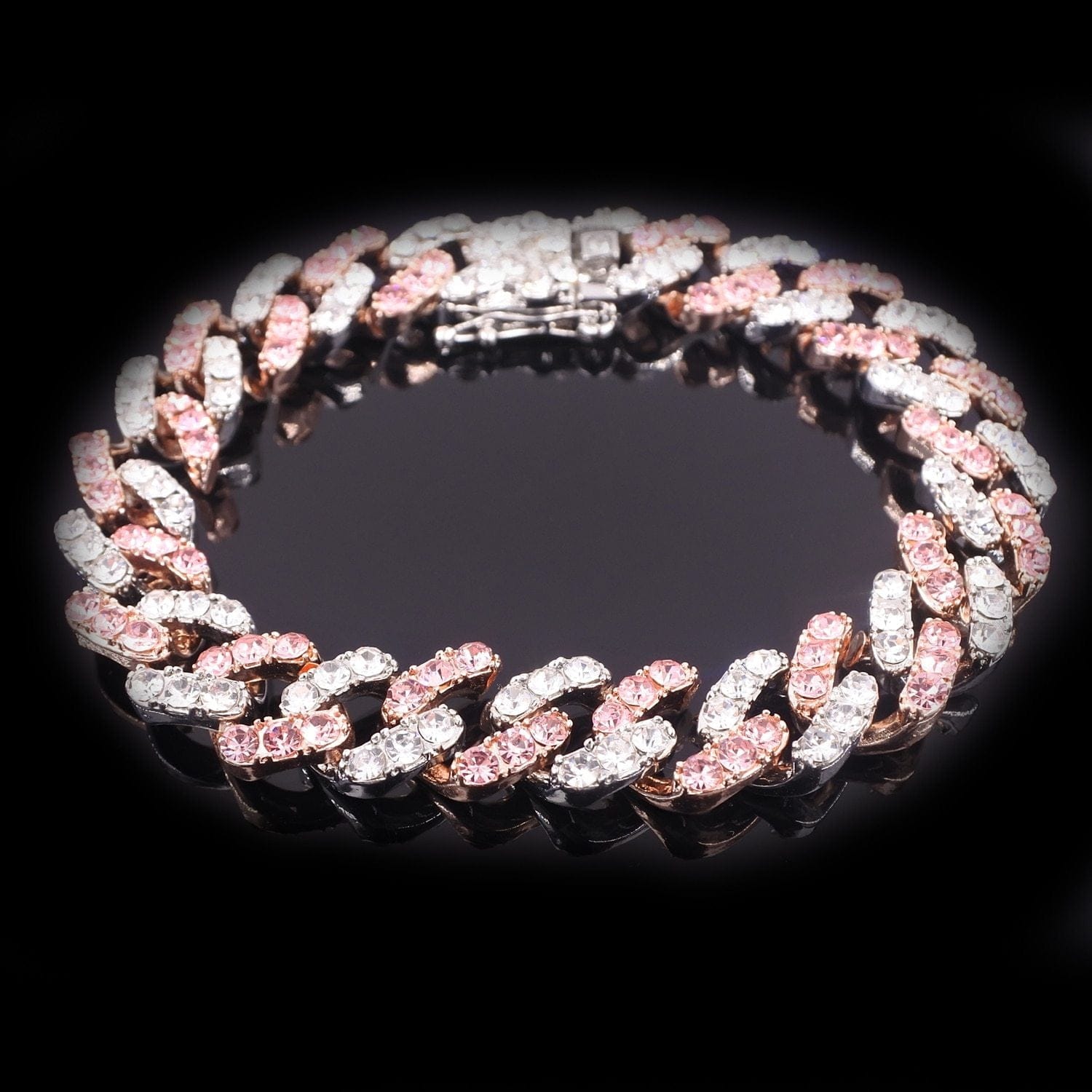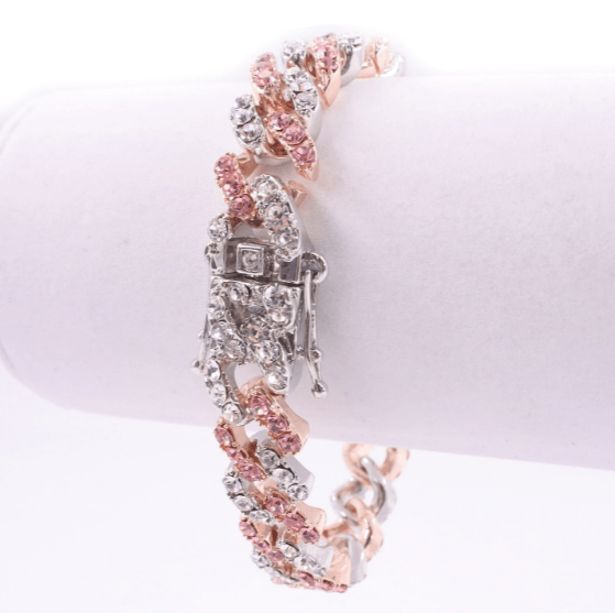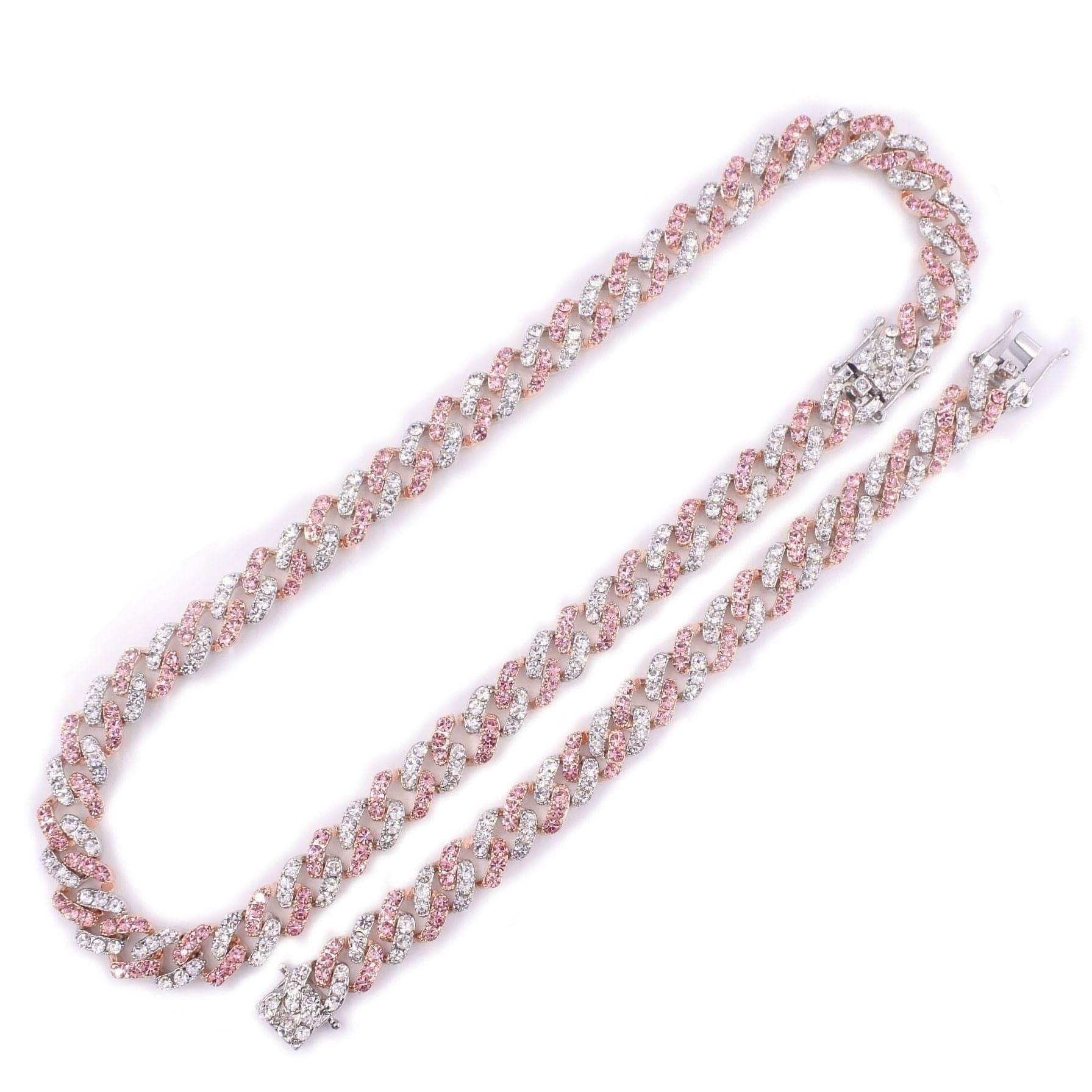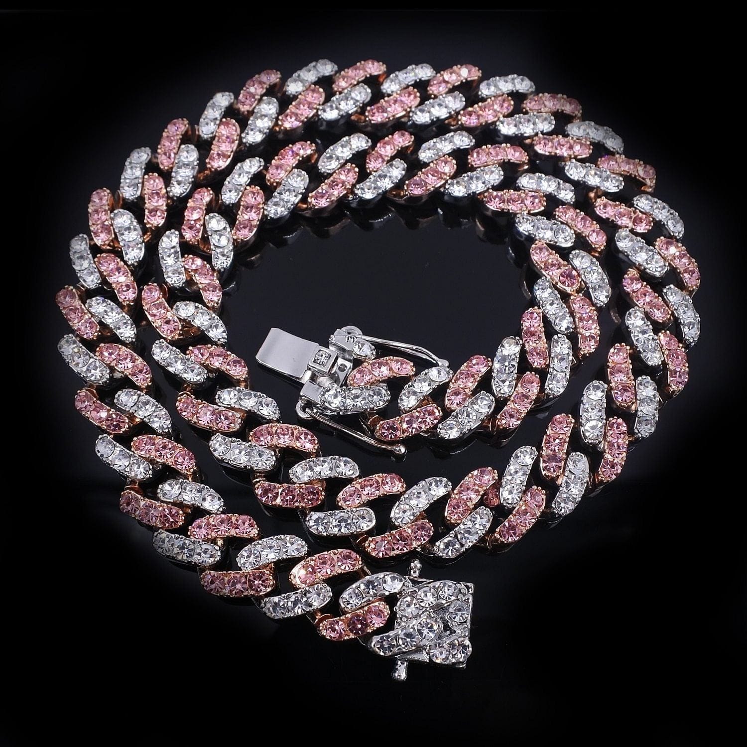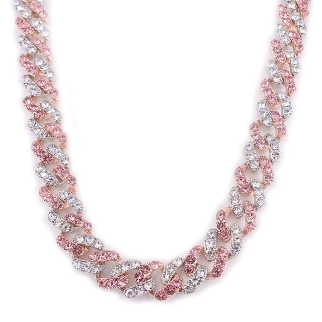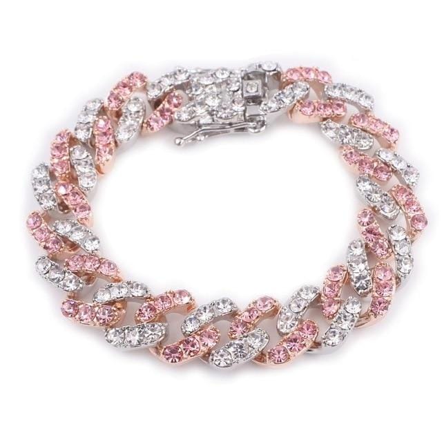 Flash some brilliance with this breathtaking two-tone Miami Cuban Link chain + FREE bracelet. It has 12mm in width and choose the length that perfectly fits you. This lightweight variant of the Cuban link chain and bracelet is embellished with a white gold pave and pink to achieve a more radiant look. It's made out of high-quality Cubic Zirconia and silver plating that would definitely make a statement to any of your outfits.