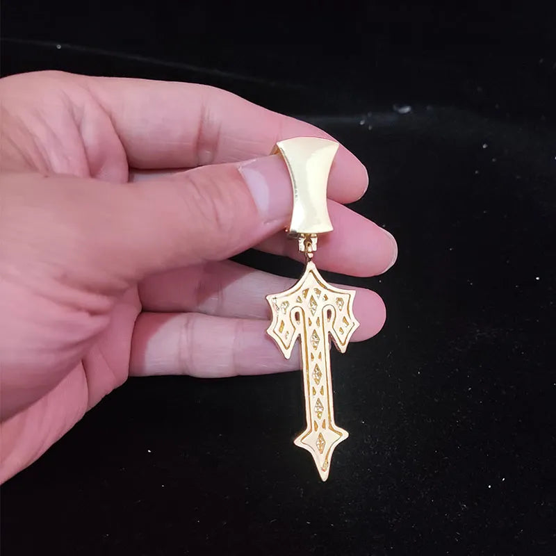 Crave the statement look of this iced out Hip Hop Letter Cross Sword Necklace! Crafted with an eye-catching gold tone in the shape of a cross and letter, this necklace puts you in the spotlight! Take risks and stand out with this daring statement piece.