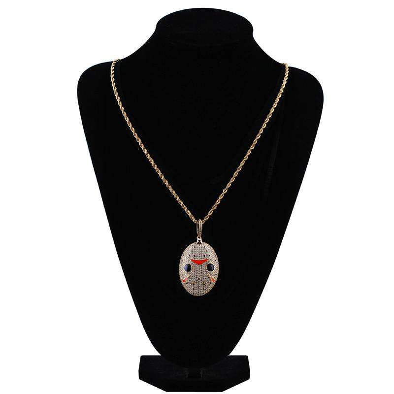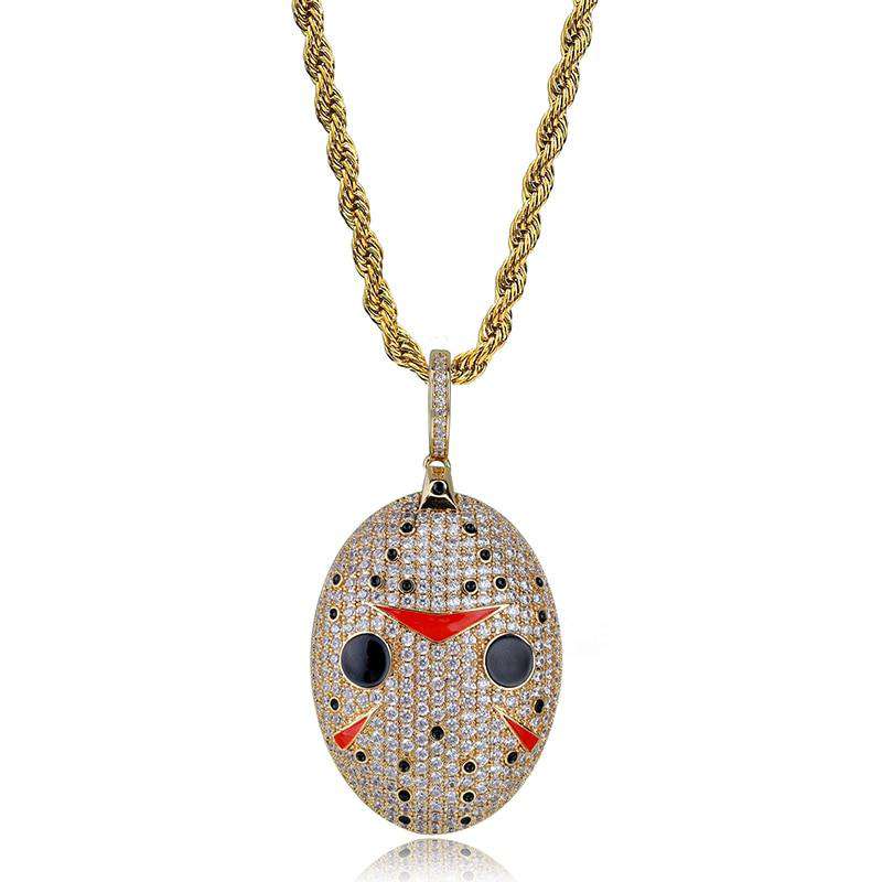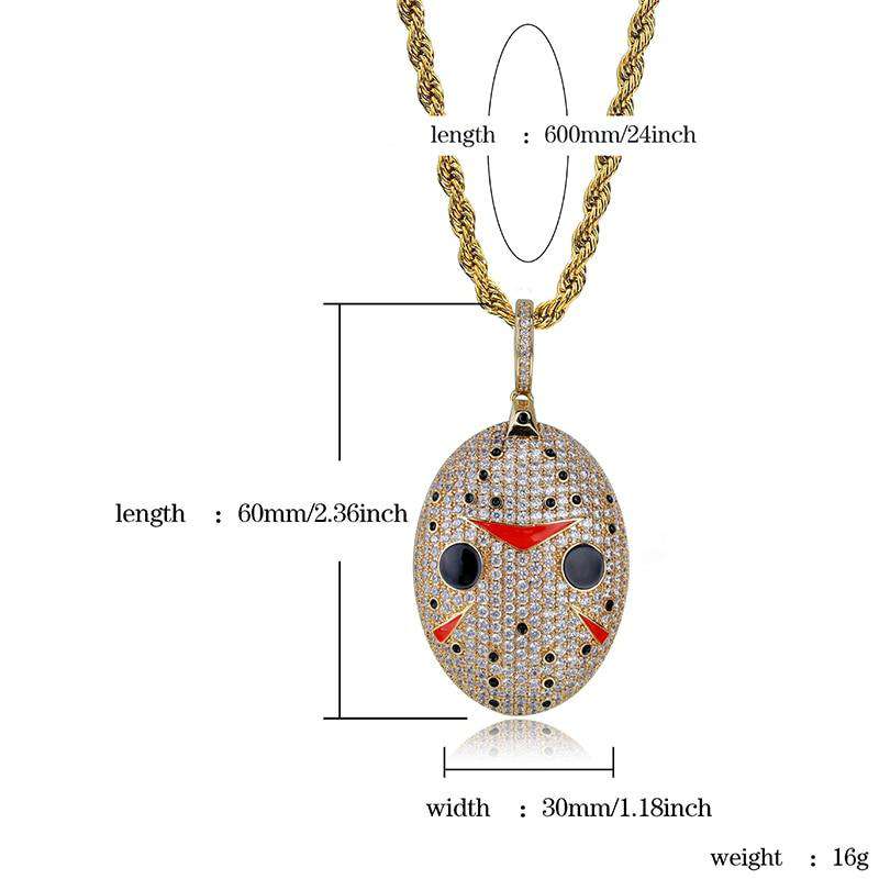 Horror movie and iced out jewelry lovers: this Jason Voorhees pendant is made for you. Halloween becomes an all year round celebration thanks to this pendant. Chain is included.