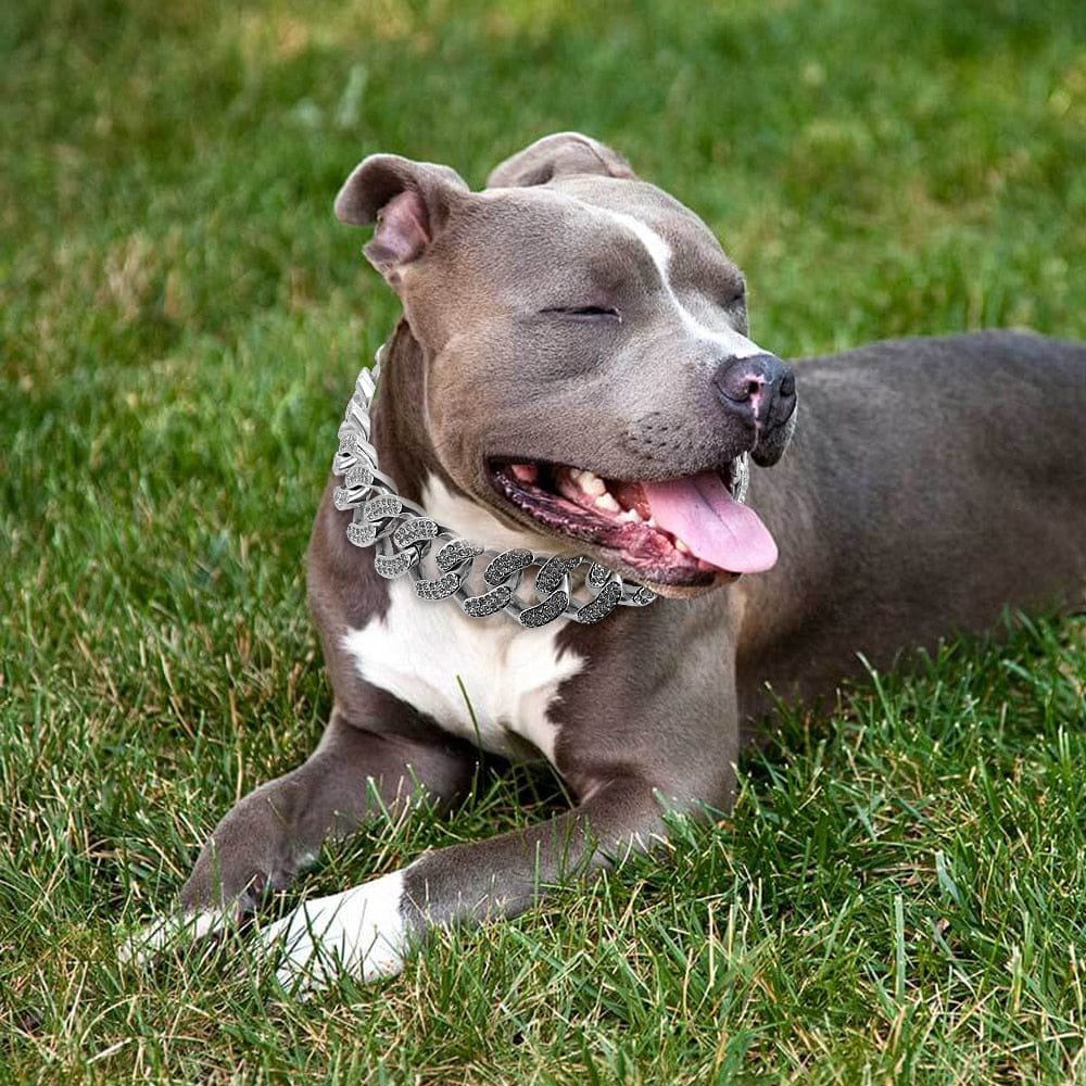 Who Needs this Collar? Do you have a dog that likes to chew? If yes, then this Collar is perfect! The luxurious Cuban link chain collar looks cool on both male and female dogs. It's designed for medium or large dogs. Whether you're training or just walking your dog this chain is solid and heavy because it is not hollow. It's made out of high-quality stainless steel with stunning CZ stones on chains that made it stand out from the crowd with premium polished craftsmanship makes the surface shiny and smooth and comfortable; we believe your Dog will be proud to wear this Collar. It's available from 17.7" to 25.5" See the provided image for measurement instruction.