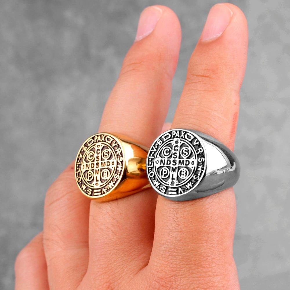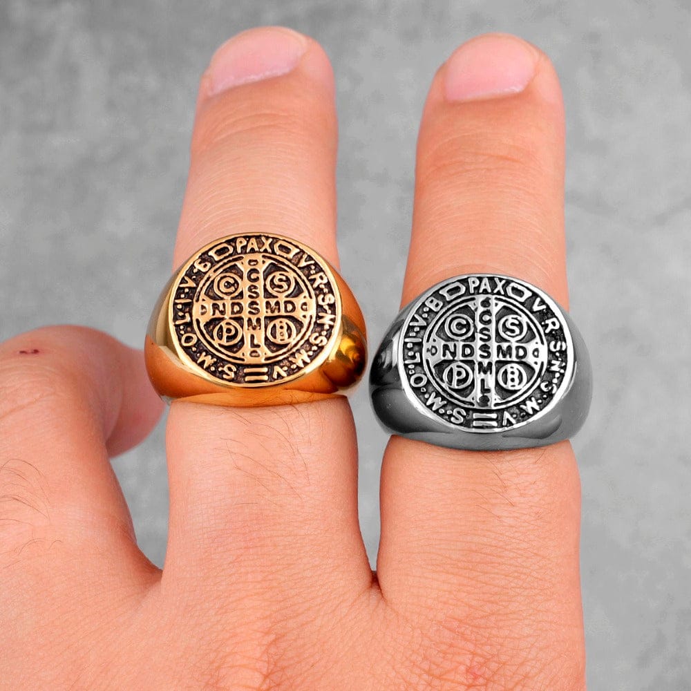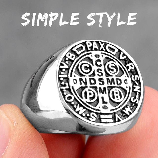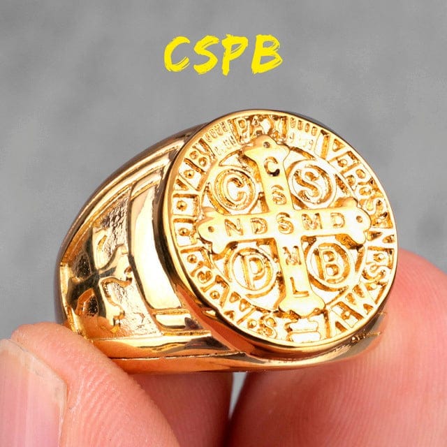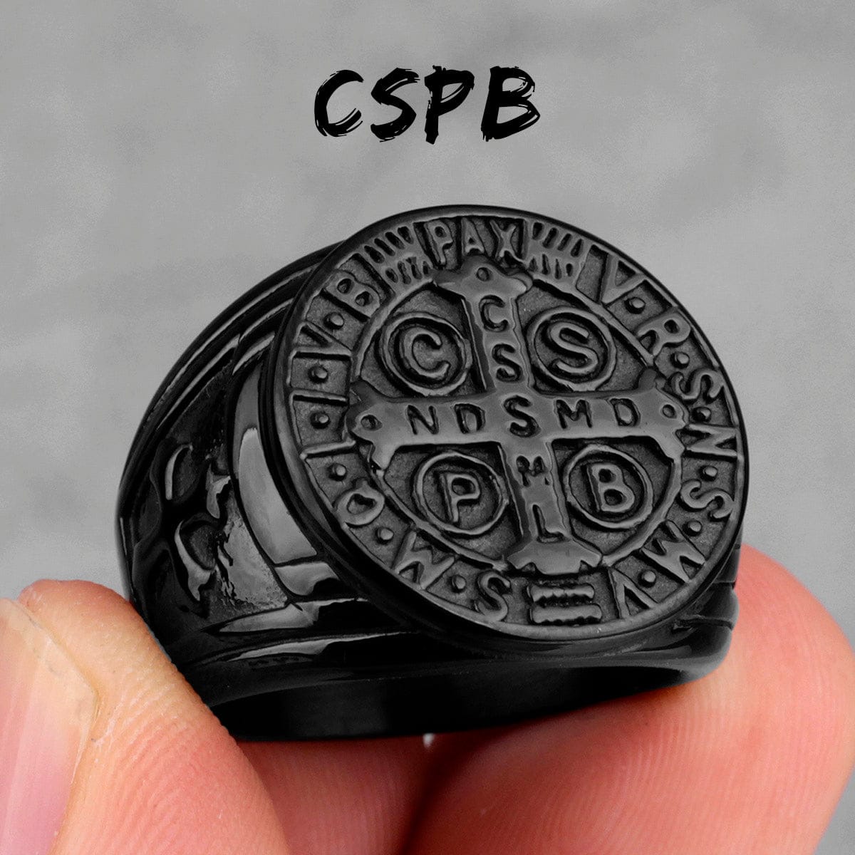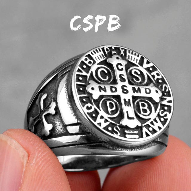 The front of the Jubilee Medal of Saint Benedict is stamped with a cross, the letters CSPB in the 4 angles around the cross stands for Crux Sancti Patris Benedicti, the Latin for "Cross of the Holy Father Benedict."