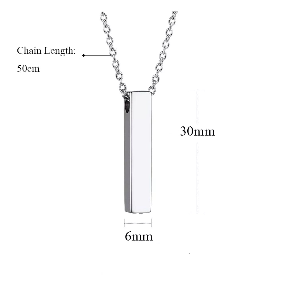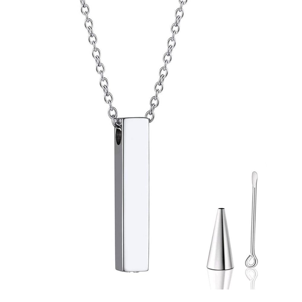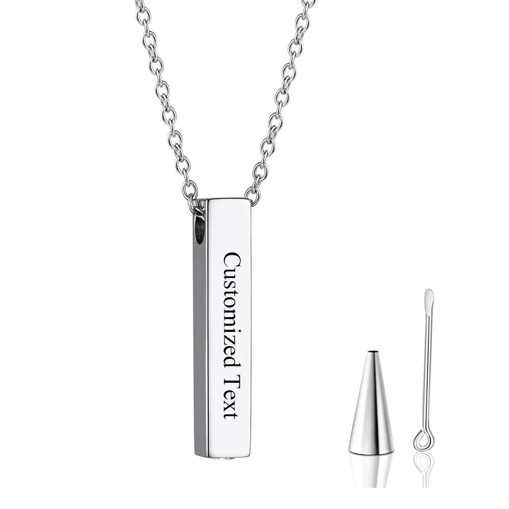 Keep cherished memories close with this elegant stainless steel vertical cubic bar container necklace, designed as a memorial urn pendant to hold ashes, hair, or other small mementos of your loved ones. This durable and hypoallergenic necklace features a sleek, modern design, perfect for everyday wear. Its secure, airtight seal ensures your treasured keepsakes stay safe. A heartfelt way to honor and carry the memory of those you hold dear. Ideal as a personalized memorial jewelry gift for family and friends.