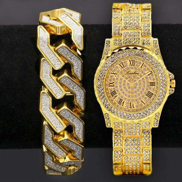 Een combinatie van ketting en armband die klassiek maar opvallend en luxueus is. Elke centimeter is bedekt met ijs dat in elke verlichting zal schitteren. Verkrijgbaar in goud en zilver. Het horloge kan apart worden gekocht.